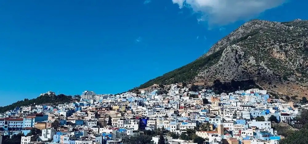 Posteriormente, nos continuamos nuestro viaje 7 días por Marruecos desde Tánger hacia Chefchaouen, conocida por su singular belleza y sus edificaciones pintadas de azul, que se despliegan sobre las laderas de las montañas del Rif. Este pintoresco pueblo cuenta con un laberinto de calles encantadoras, miradores con vistas panorámicas y una kasbah que evoca épocas pasadas. Después de disfrutar de una visita libre por la zona más antigua de la ciudad, te alojarás en un acogedor riad en plena medina, un lugar ideal para relajarte y reponer energías.