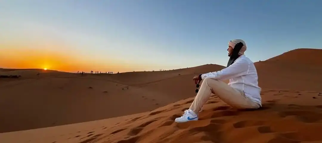 Nos despertaremos antes del amanecer para presenciar la espectacular salida del sol sobre las grandes dunas de Erg Chebbi en Merzouga. Este es un momento mágico que te dejará sin aliento. Después de disfrutar de una ducha refrescante, desayunaremos en nuestro campamento del desierto.