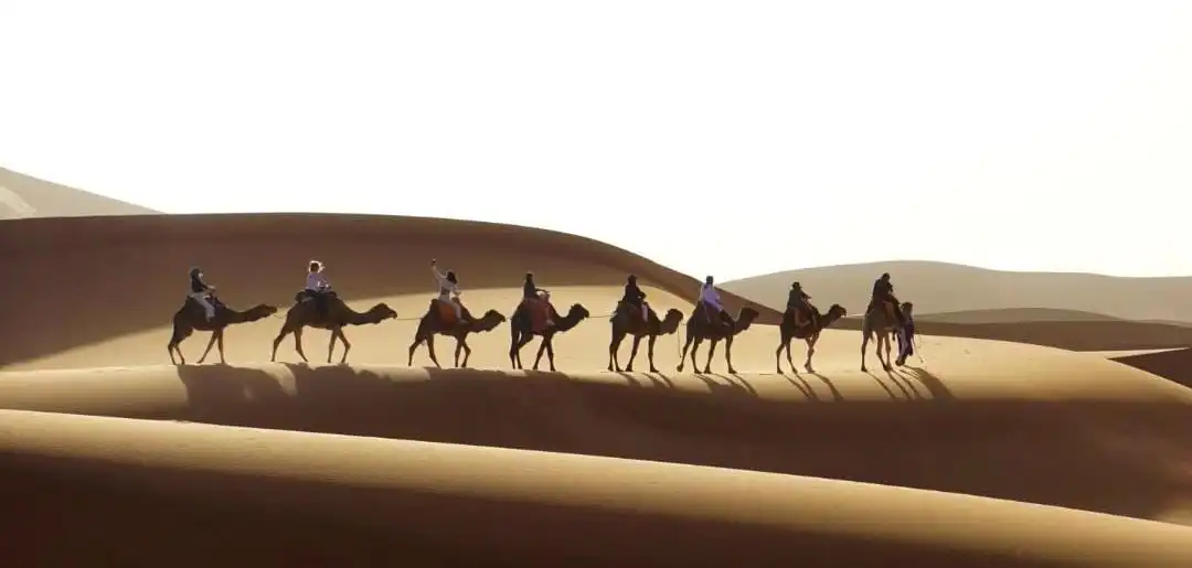 Por la tarde, llegamos a Merzouga, donde dejaremos el vehículo y nos subiremos a dromedarios para explorar las altas dunas. Durante el tour desierto Marruecos, serás testigo de una de las puestas de sol más memorables que puedas imaginar.